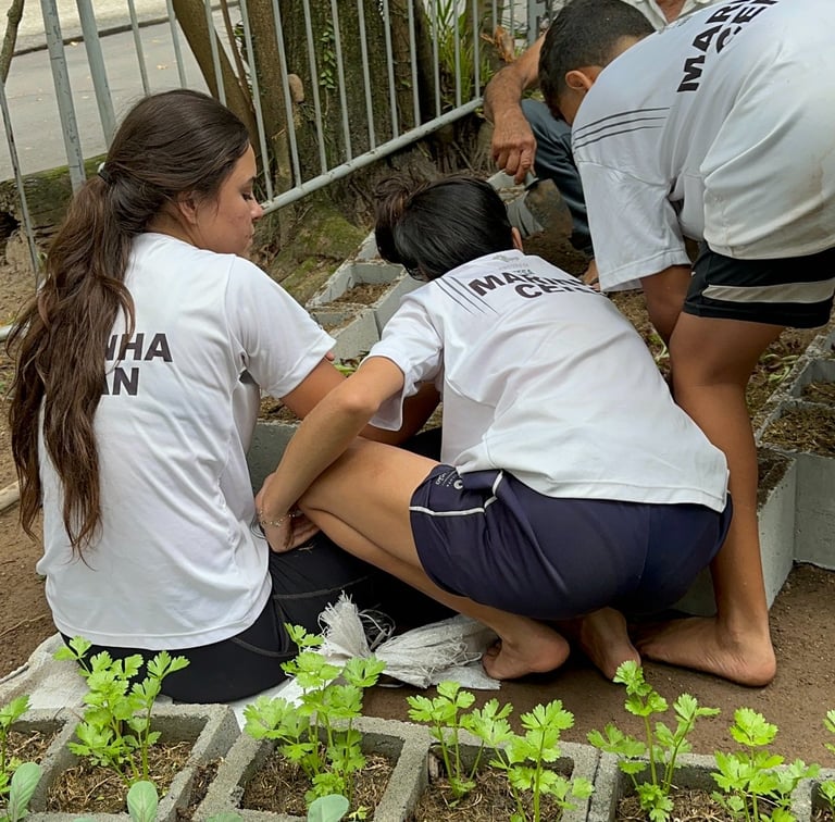 O contato direto com a terra e o manejo das plantas aproxima as crianças da natureza e reforça valores de consciência ambiental e hábitos mais sustentáveis.